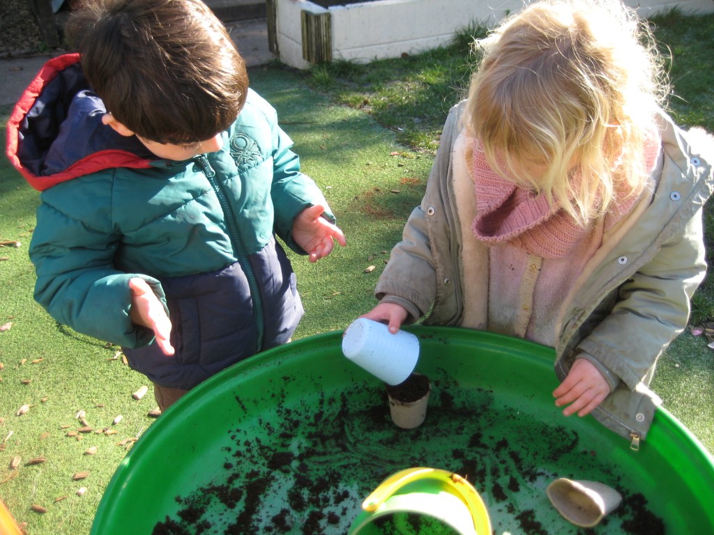 We used pots and gardening tools to scoop up the soil, once our plant pots were full we carefully pushed a little seed down into the soil and gave it a little water.