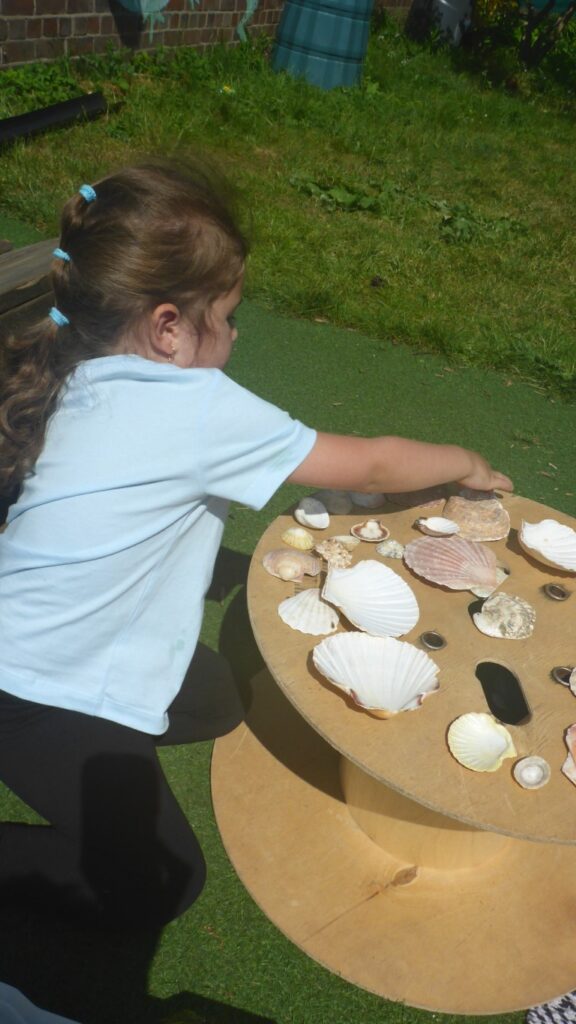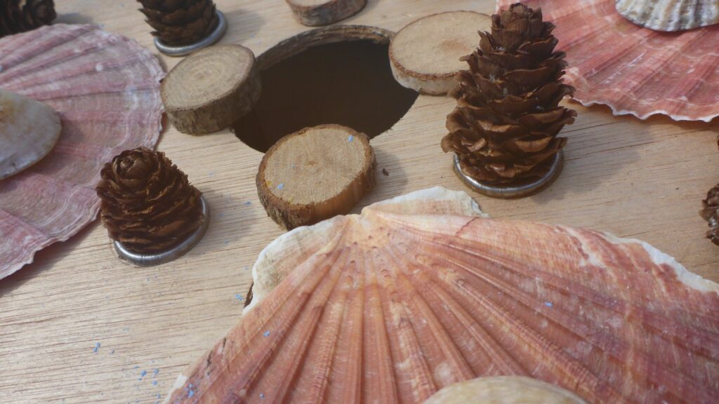 Using wooden cable reels as their canvas, our young artists have been carefully arranging shells, pinecones, and wooden discs into beautiful displays.