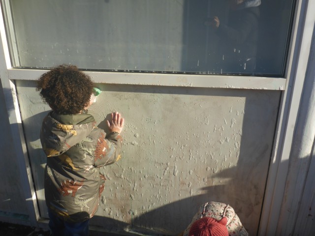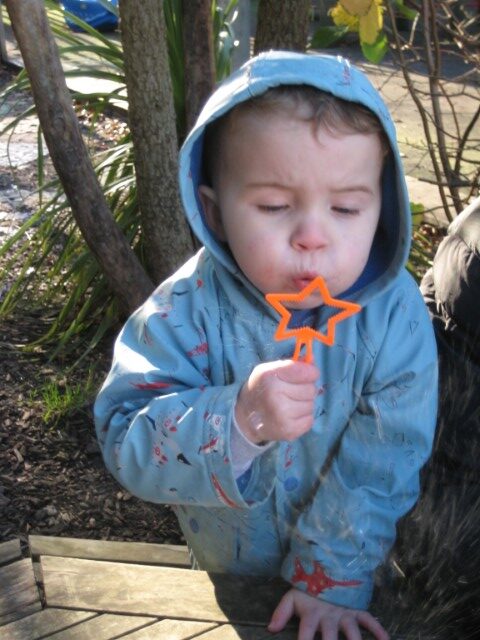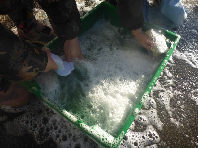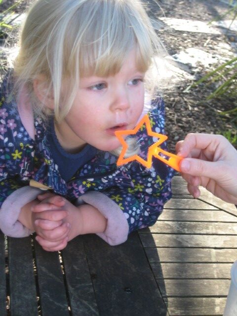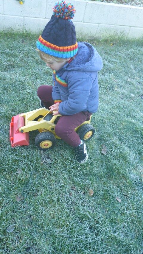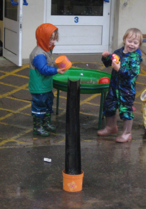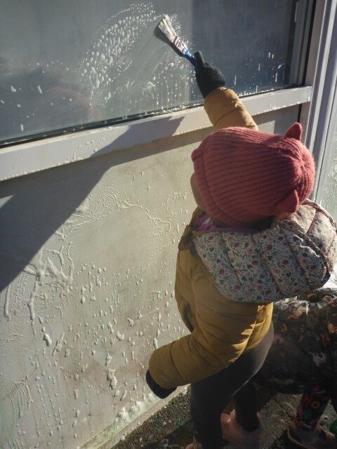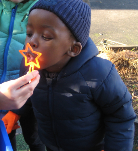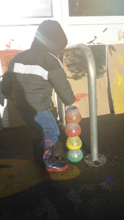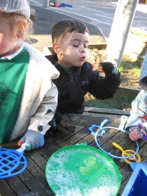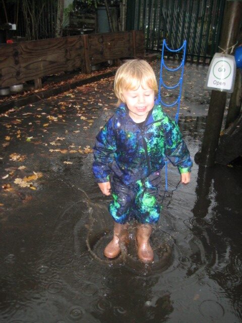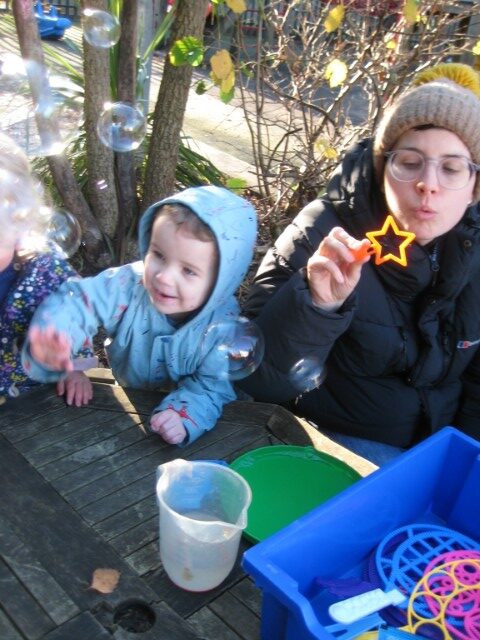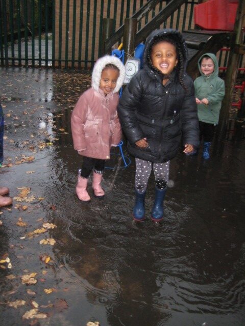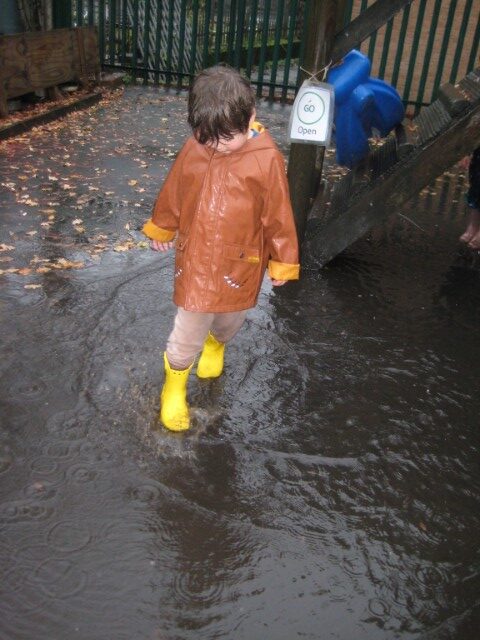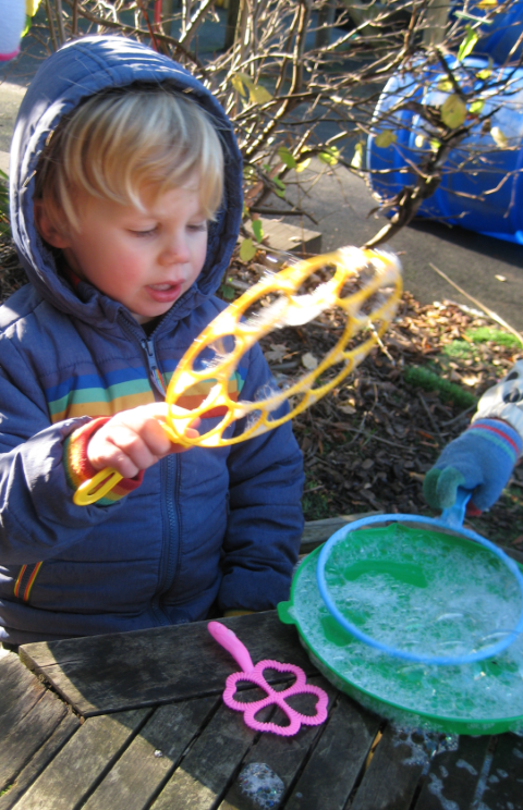 Bubbles are a great activity for cold, dry days. We have been learning to blow air through the bubble wands, developing breath control and hand-eye coordination whilst creating magical floating spheres to chase and catch. Wet days are for splashing and exploring water, embracing all weather conditions and discovering the properties of puddles and rain whilst building resilience and enjoyment of outdoor play whatever the season.