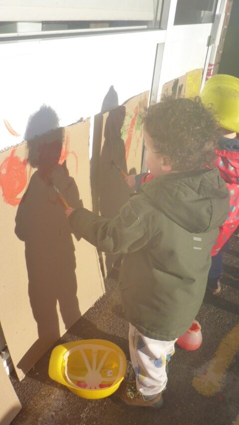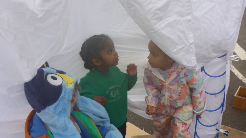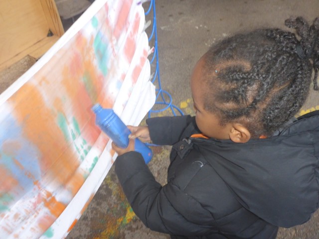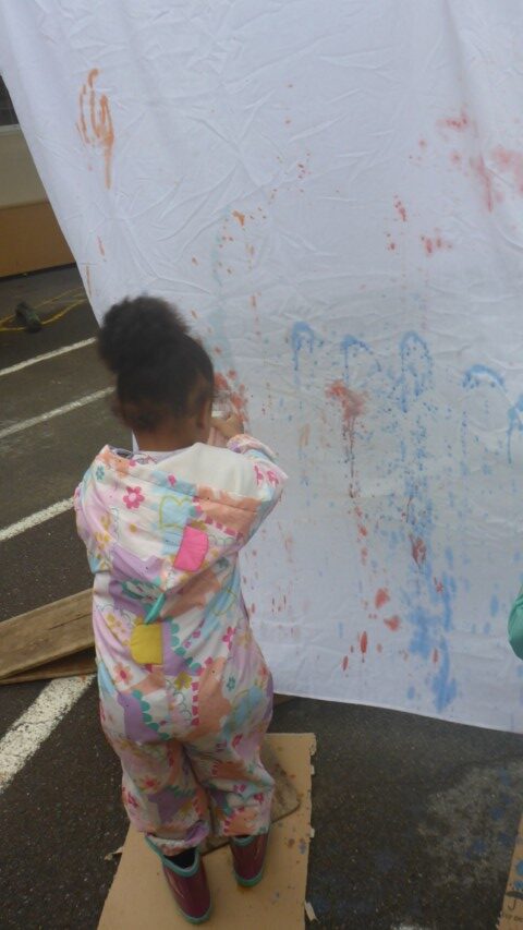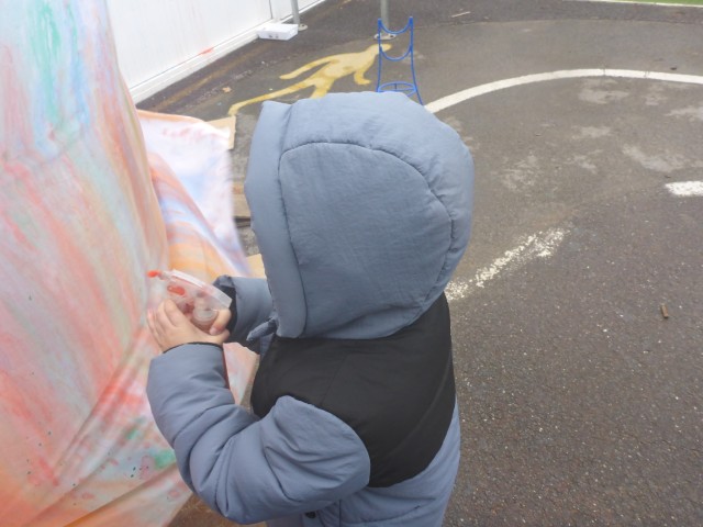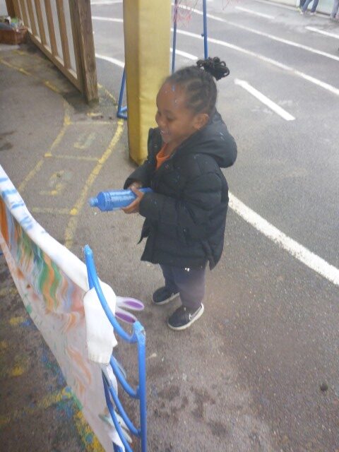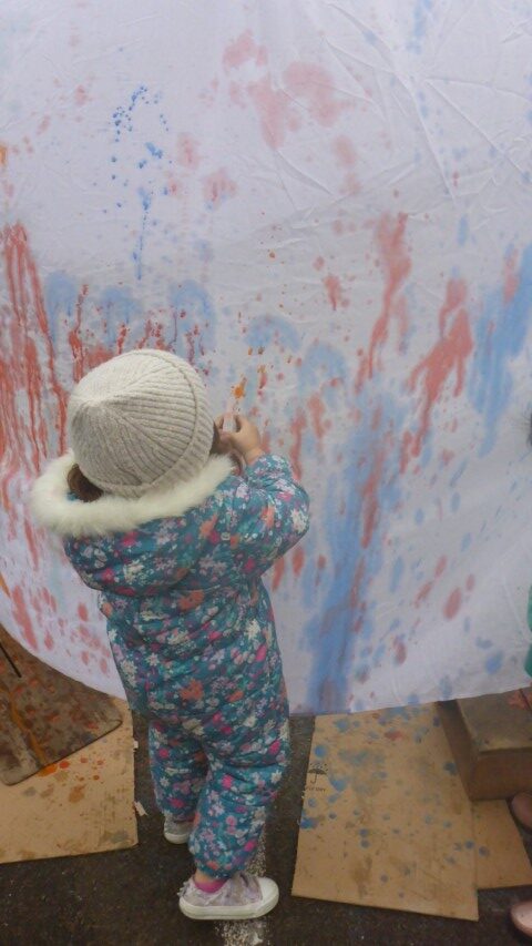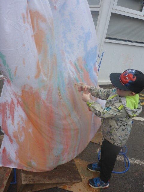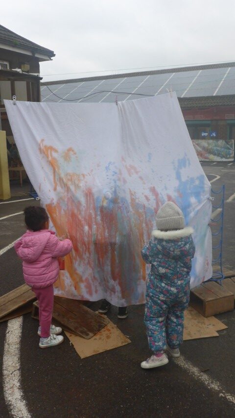 Children from our two-year-olds and three-year-olds have been making marks in the garden through exciting large-scale art experiences. We hung white sheets from the washing lines in the garden and used spray bottles filled with paint to transform them, creating dramatic splashes of colour whilst developing hand strength and coordination. Some of the children said, “we are artists!” showing wonderful recognition of themselves as creative makers.