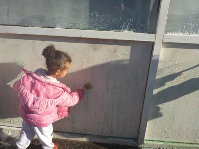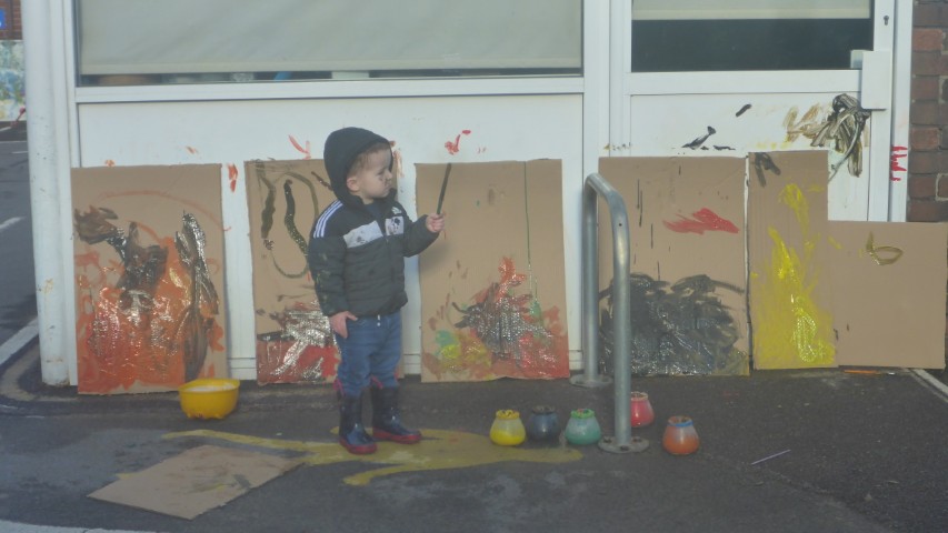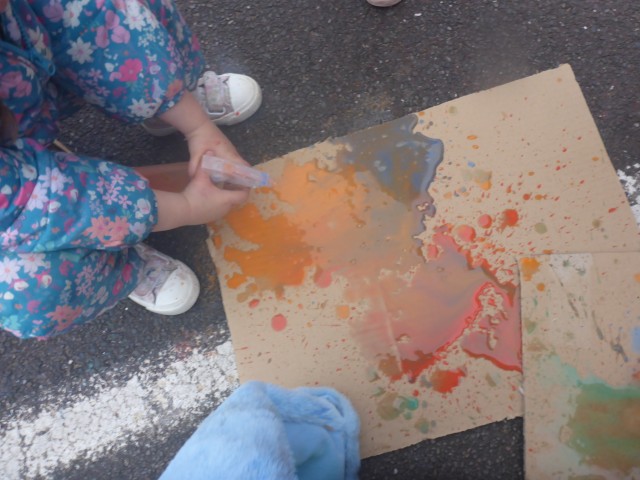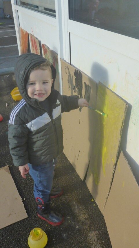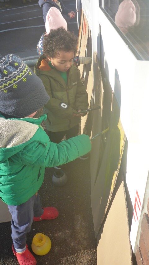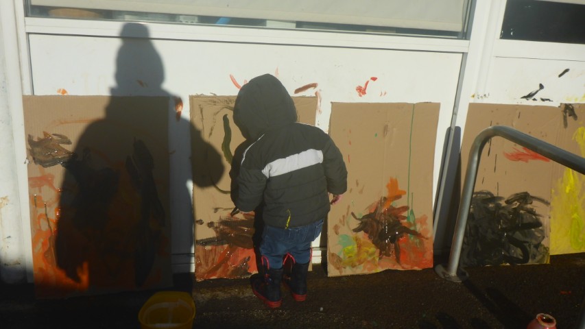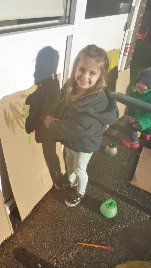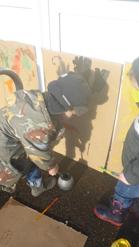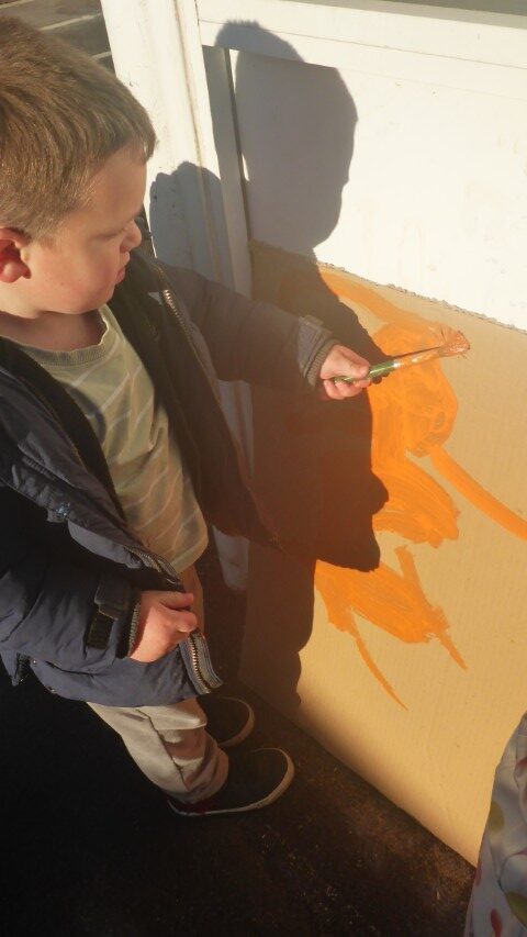 The next day we continued making marks, this time using traditional paint brushes and paint on cardboard, exploring different techniques and tools for artistic expression. Afterwards the children helped to clean up with soapy water, brushes, and sponges, taking responsibility for tidying their workspace. We washed it all down with the hose, which was just as much fun as the painting! “Best day ever!” said one of the children, capturing the joy and engagement of these outdoor creative experiences.