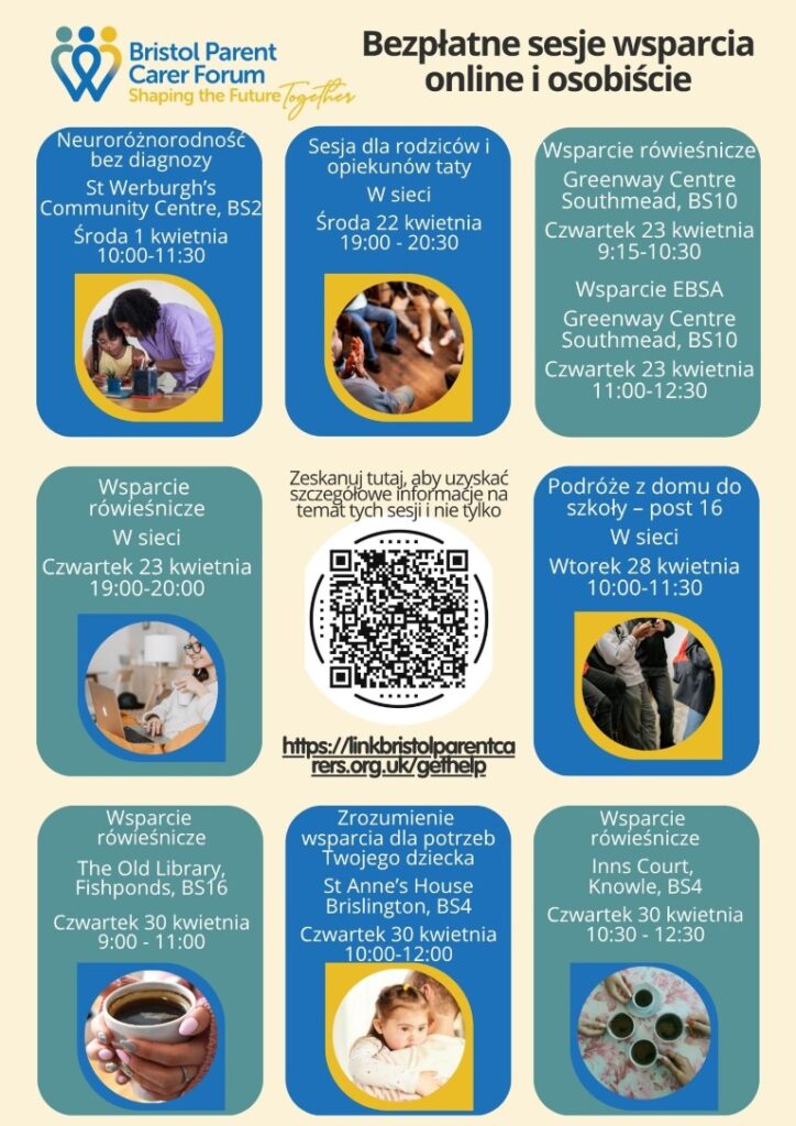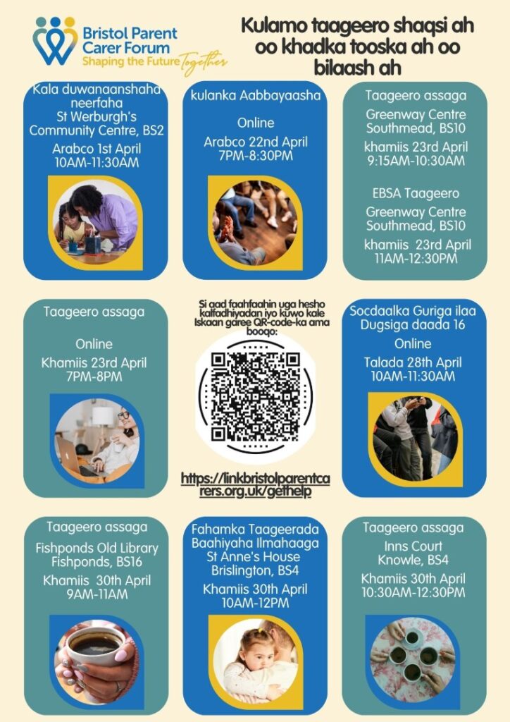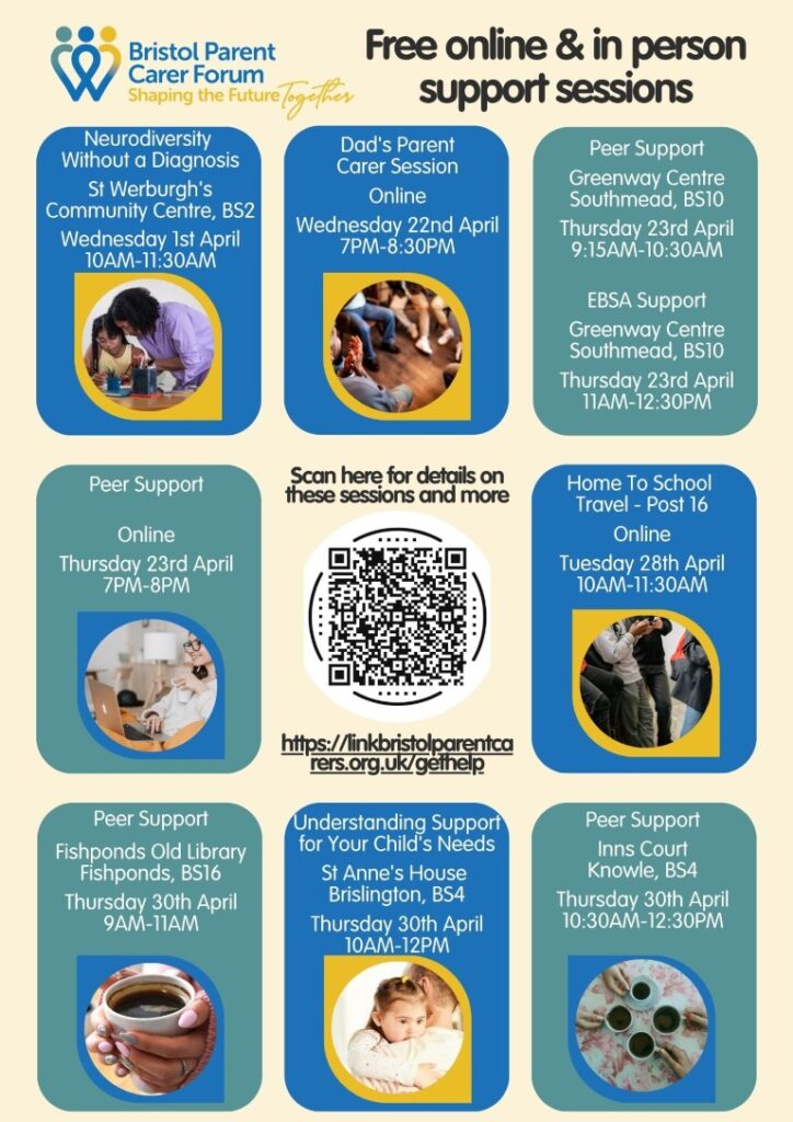 In our local community, there are a range of free online and in‑person support sessions available for parents and carers, organised by Bristol Parent Carer Forum. These sessions cover a variety of topics, including peer support, understanding your child’s needs, neurodiversity, and help with home‑to‑school travel. They offer a welcoming space to connect with others, ask questions, and access practical guidance. You can explore the upcoming dates below and join any sessions that feel useful for you and your family.
