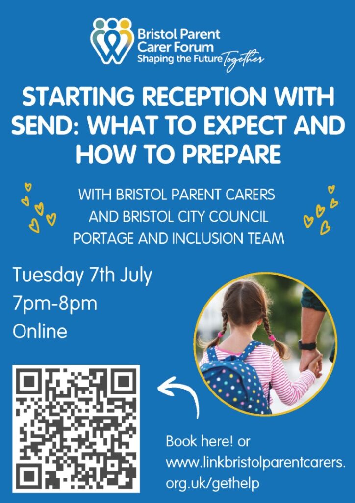 This session is being delivered by Bristol Parent Carers in partnership with Bristol City Council’s Portage and Inclusion Team. It will focus on what to expect when children start Reception and how families can prepare for this important transition. The event will take place online on Tuesday 7 July from 7pm to 8pm, making it accessible for parents and carers to join from home.